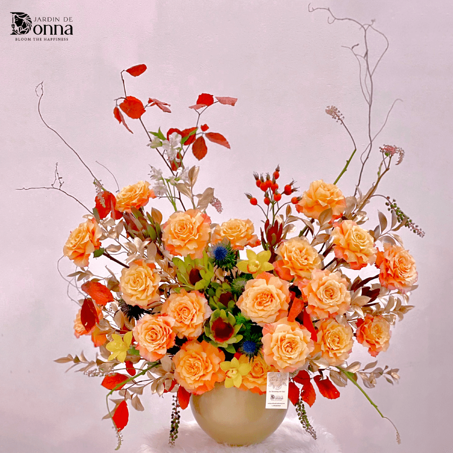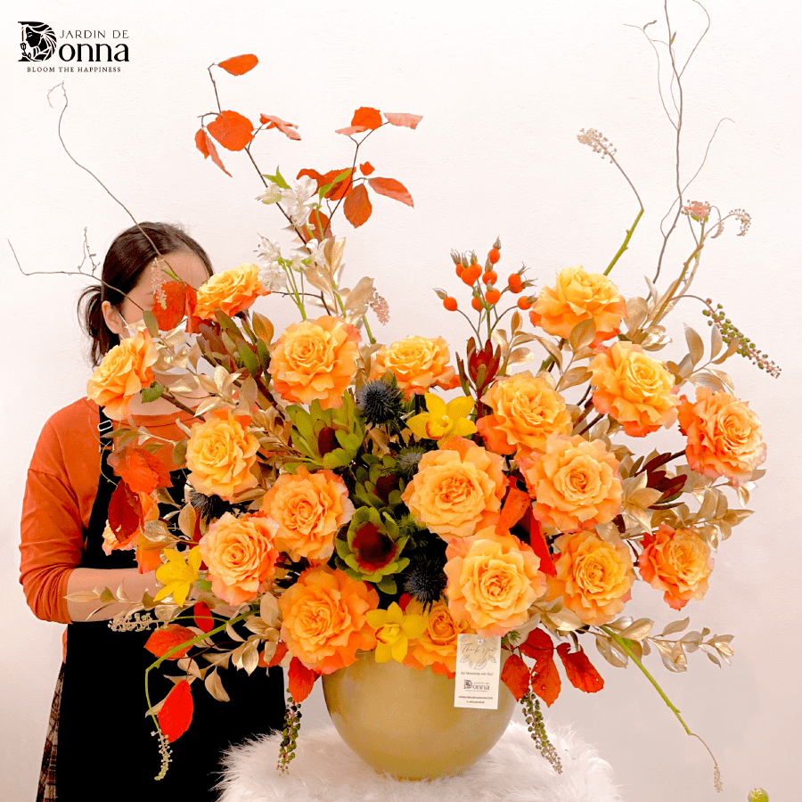 Lưu ý: Sản phẩm bình hoa mẫu chỉ mang tính chất tham khảo. Bởi vì: một số loại hoa trong mẫu theo mùa sẽ không có hoặc chất lượng không đảm bảo, do đó chúng tôi sẽ dùng các loại hoa khác thay thế. Nhưng Jardin de Donna đảm bảo định lượng, tone màu, kiểu dáng cũng như chất lượng hoa tươi đẹp và đầy đặn nhất. Bạn sẽ nhận được ảnh hoàn thiện trước khi chúng tôi giao hoa.