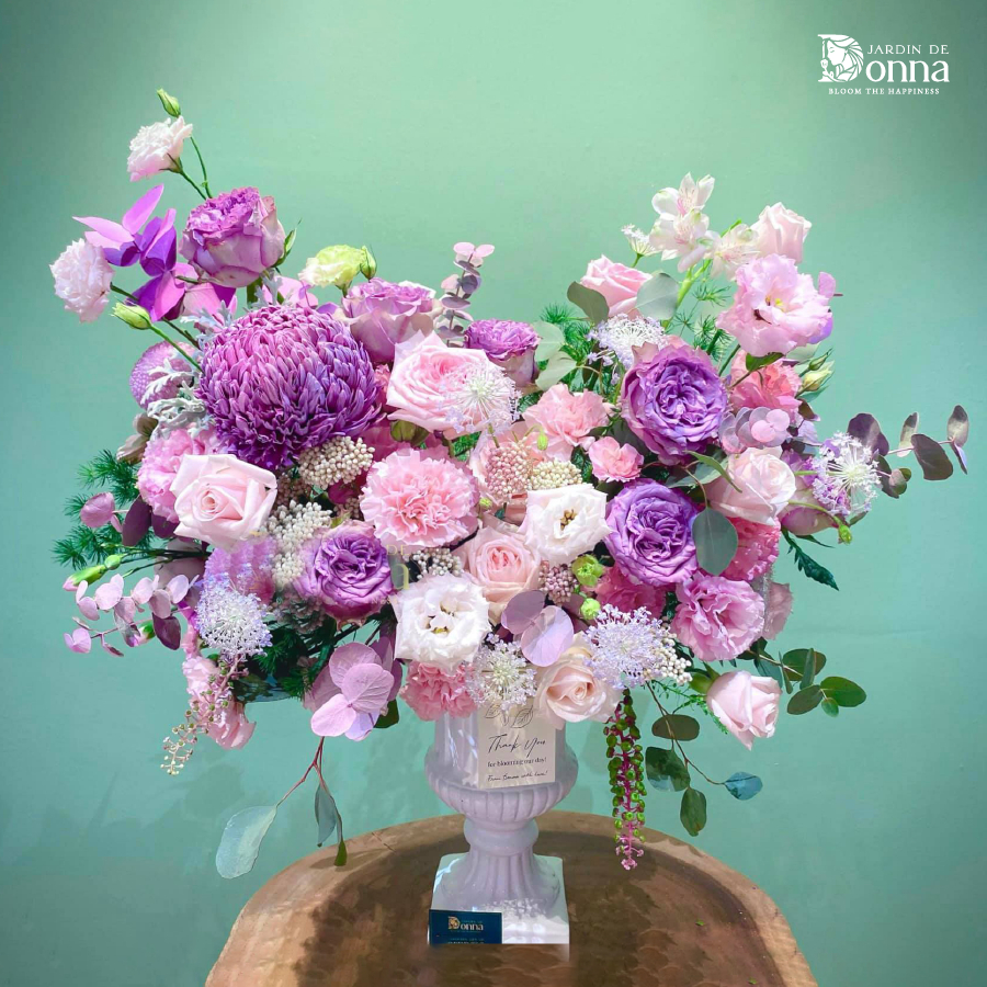 Lưu ý: Sản phẩm bình hoa mẫu chỉ mang tính chất tham khảo. Bởi vì: một số loại hoa trong mẫu theo mùa sẽ không có hoặc chất lượng không đảm bảo, do đó chúng tôi sẽ dùng các loại hoa khác thay thế. Nhưng Jardin de Donna đảm bảo định lượng, tone màu, kiểu dáng cũng như chất lượng hoa tươi đẹp và đầy đặn nhất. Bạn sẽ nhận được ảnh hoàn thiện trước khi chúng tôi giao hoa.