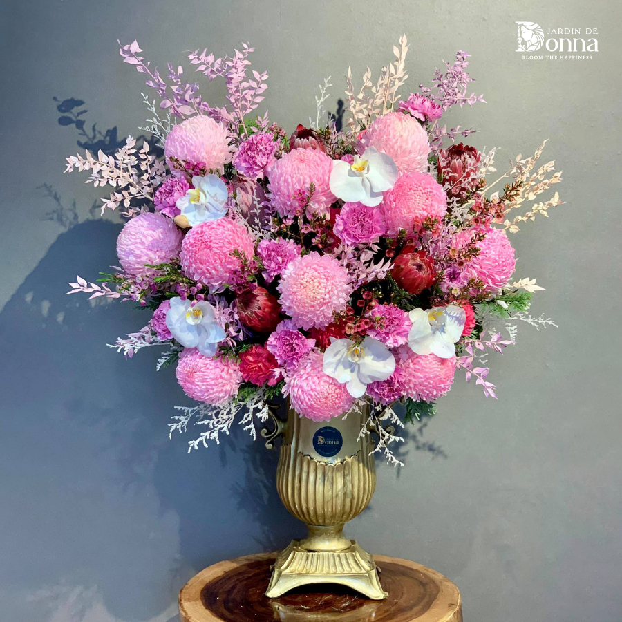 Lưu ý: Sản phẩm bình hoa mẫu chỉ mang tính chất tham khảo. Bởi vì: một số loại hoa trong mẫu theo mùa sẽ không có hoặc chất lượng không đảm bảo, do đó chúng tôi sẽ dùng các loại hoa khác thay thế. Nhưng Jardin de Donna đảm bảo định lượng, tone màu, kiểu dáng cũng như chất lượng hoa tươi đẹp và đầy đặn nhất. Bạn sẽ nhận được ảnh hoàn thiện trước khi chúng tôi giao hoa.